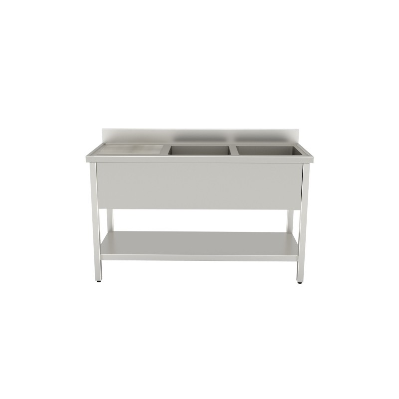 Lavello a giorno su gambe ecoline in acciaio inox aisi 304 con ripiano inferiore 2 vasche gocciolatoio sinistro 1600x700x850/900 h